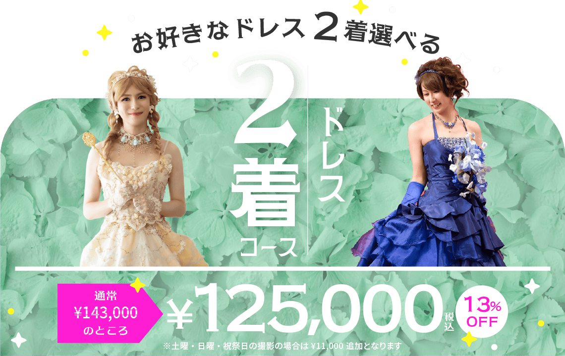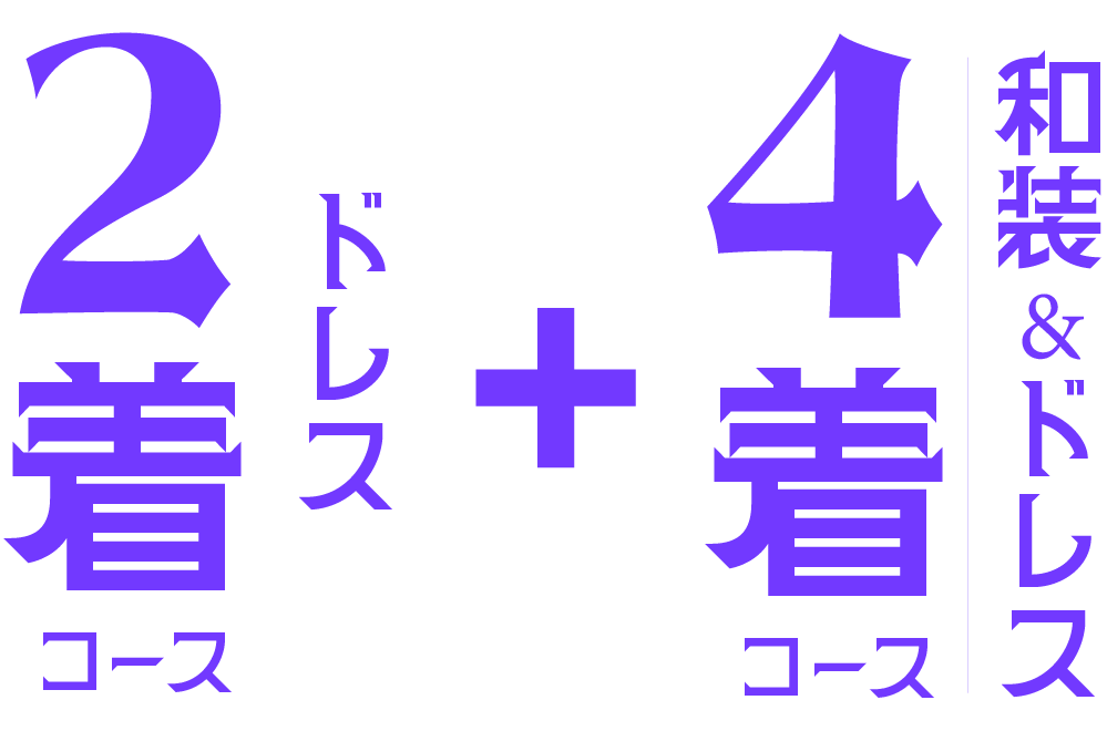 ドレス2着と和装2着の計4着をお選びいただけるので、ご希望に合わせてさまざまな組み合わせが可能。 存分に変身体験をお楽しみいただけるコースです。