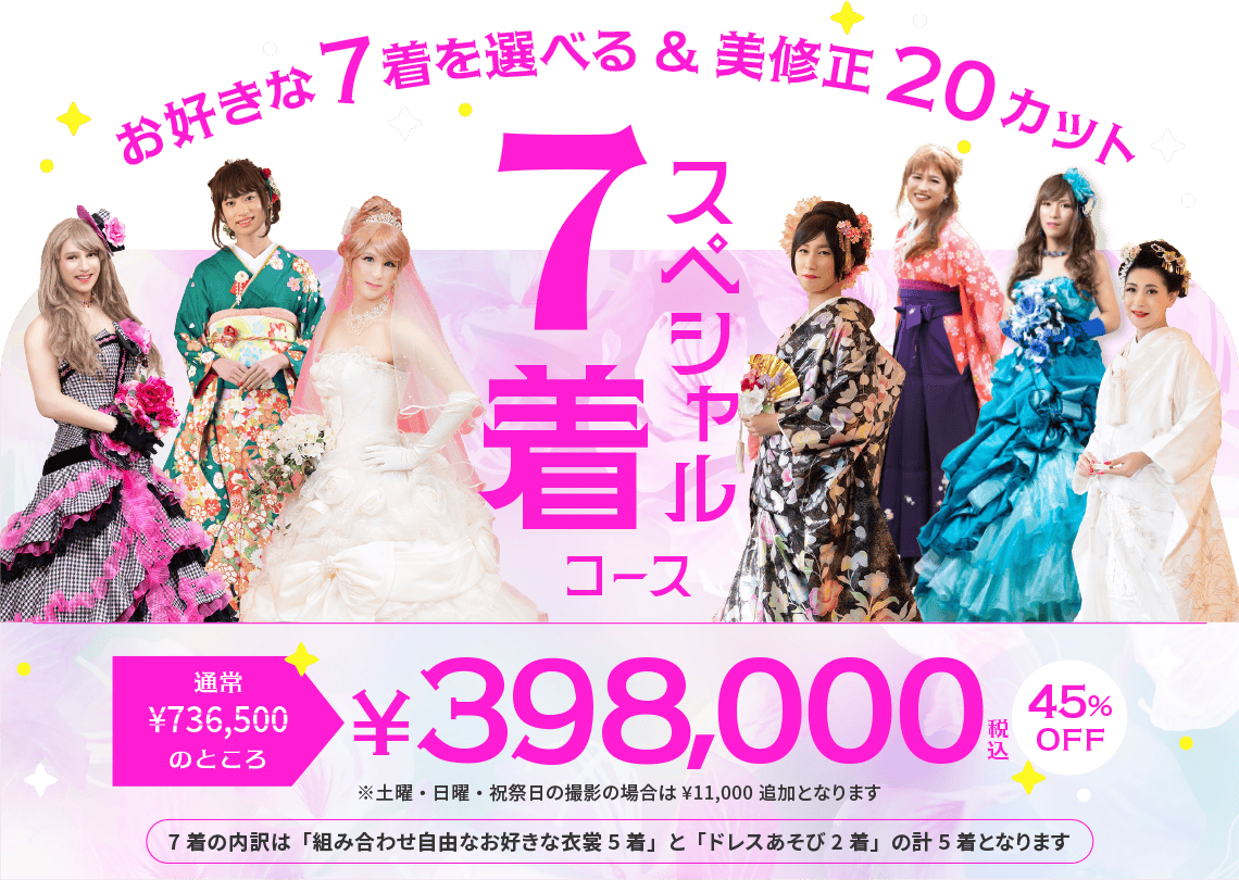 お衣装は、各種ドレスに加えて、振袖や卒業袴、婚礼和装などの和装もチョイス可能。 様々なドレスを7着選ぶもよし、ドレスと着物の組み合わせもよし、あなた好みの衣裳構成を。衣裳選びも、変身タイムも、撮影も、心ゆくまでお楽しみください。