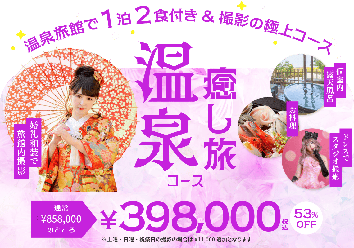 「癒し旅温泉コース」の先着3名様はキャビネアルバム(1ポーズ)のプレゼントになります