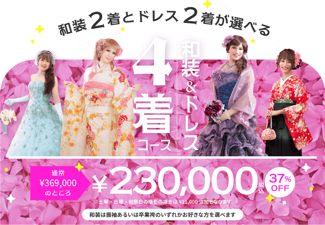 ※通常は4着ランクアップ衣裳を着用の場合、88,000円のオプション料金がかかります。